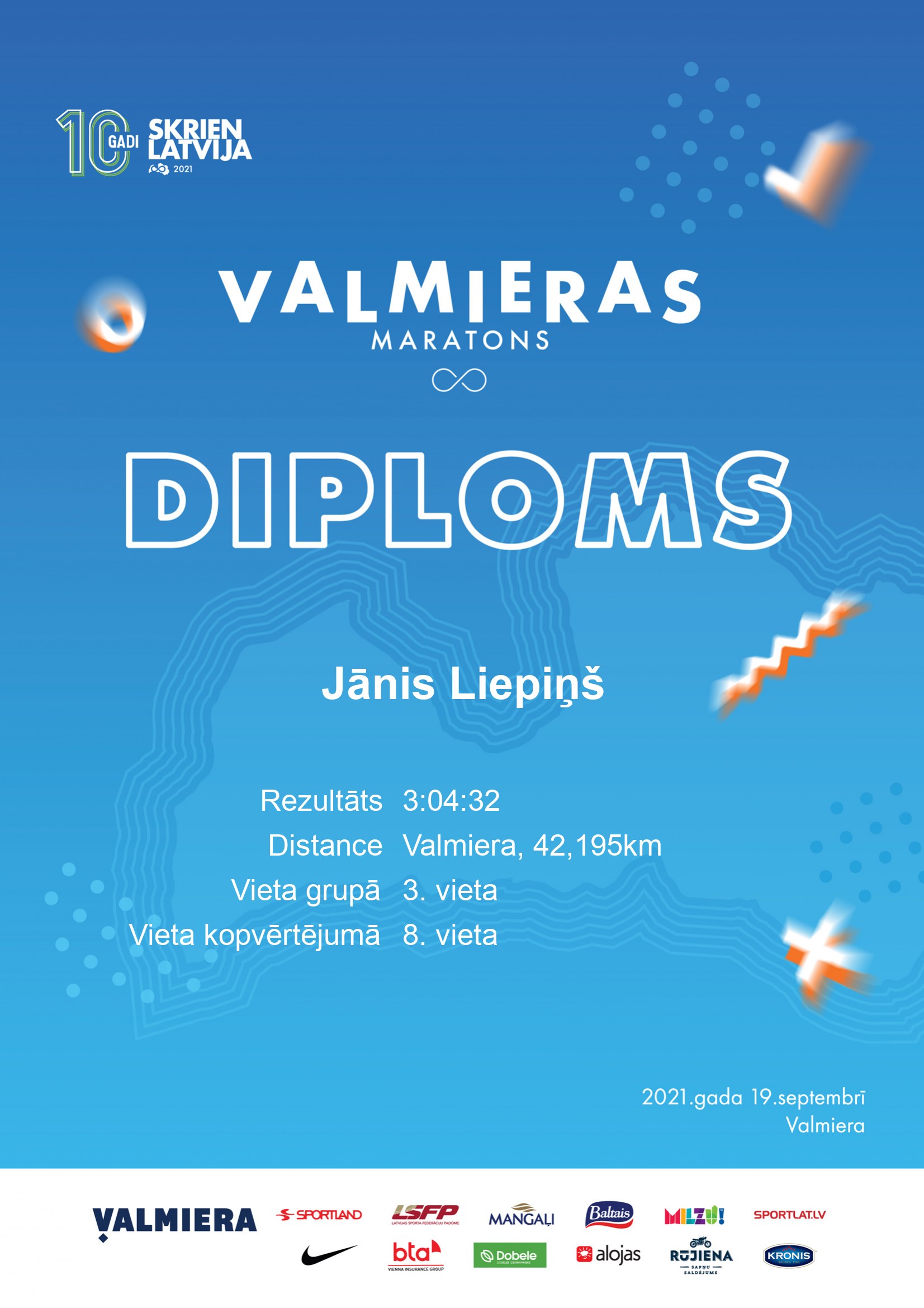 | 3. | | Ritvars | Kalniņš | Skrienam kopā | Valmiera | VM40 | 8 | 2:57:18 | Diploms |