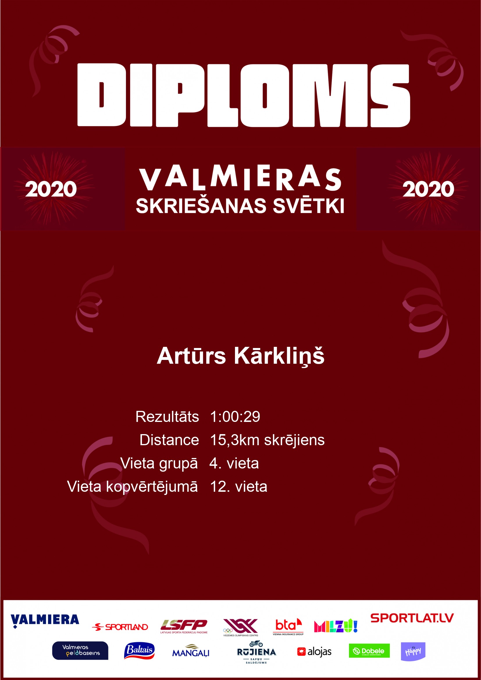 | 12. | Artūrs | Kārkliņš | Vaidava | Kocēnu novads | V30 | 4 | 1:00:29 | Diploms | |